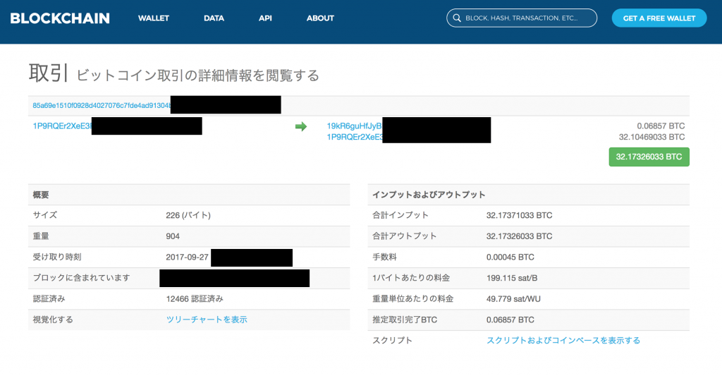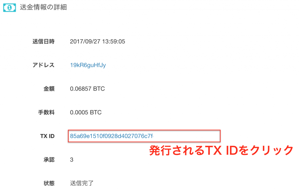 ここで発行されているTXID(トランザクションID)をクリックすると送金の詳細情報に飛びます。