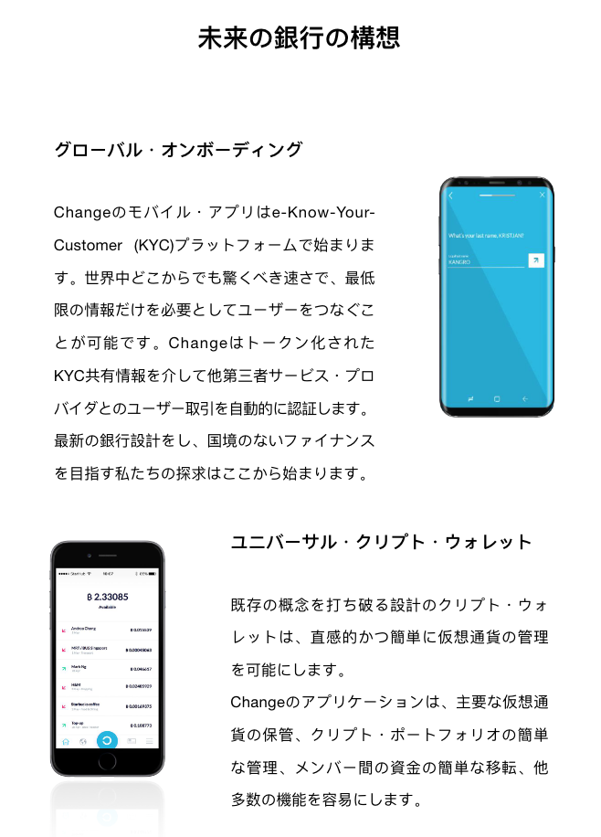 Changeは、発行されたトークンを利用して、全ての人が代替金融サービスにアクセスできるようになります。これより、今までの銀行の概念を変えようとしています。