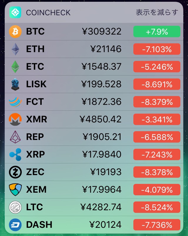 先程のスクリーンショットなので、ビットコイン以外は全部下落していますね。