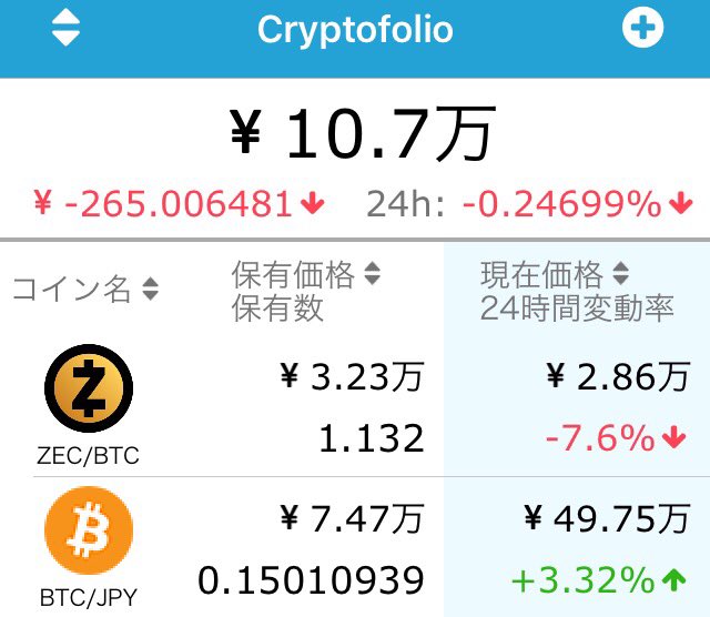 ちょっと入ってる通貨がポートフォリオアプリに無いのでbtc換算可能だったのでbtcに全て入れました。。