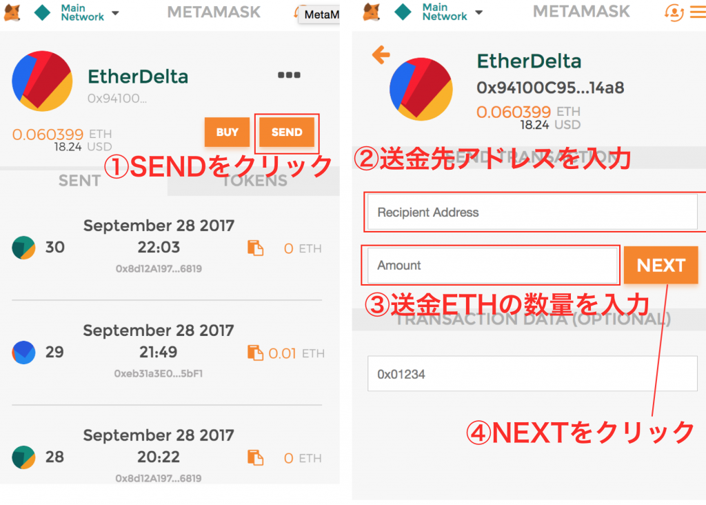 この送金先のアドレスに先程作った、MyEtherWallet、MetaMaskからETHを送金します。
