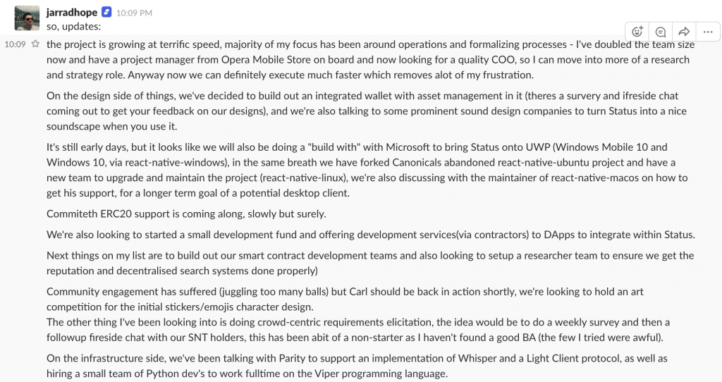 Statusのトップのjarradもとうとう見かねたのか、Slackにてアップデートを出していました。