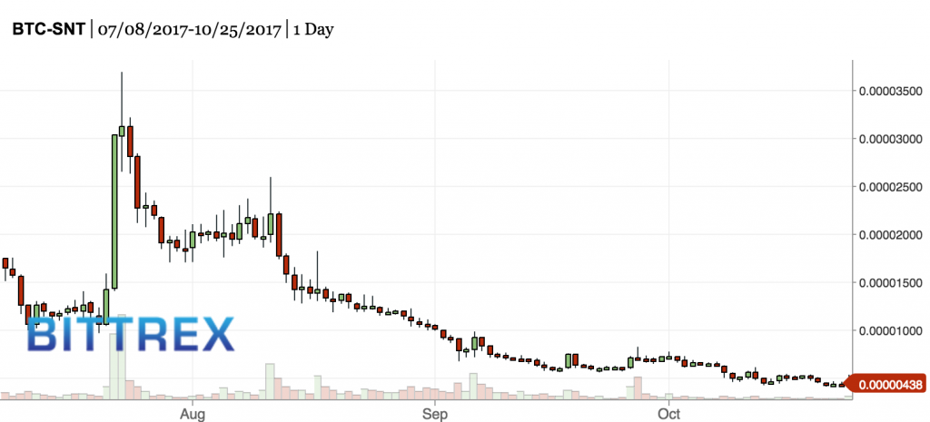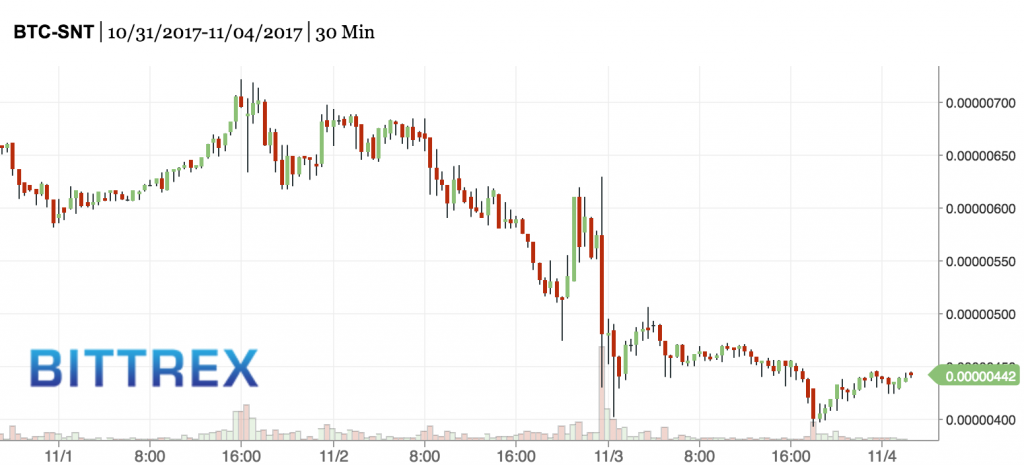 ビットコインの暴騰が原因による、他通貨の下げを考慮しても、発表直後くらいにSNTは奈落に落ちてしまいました。。。